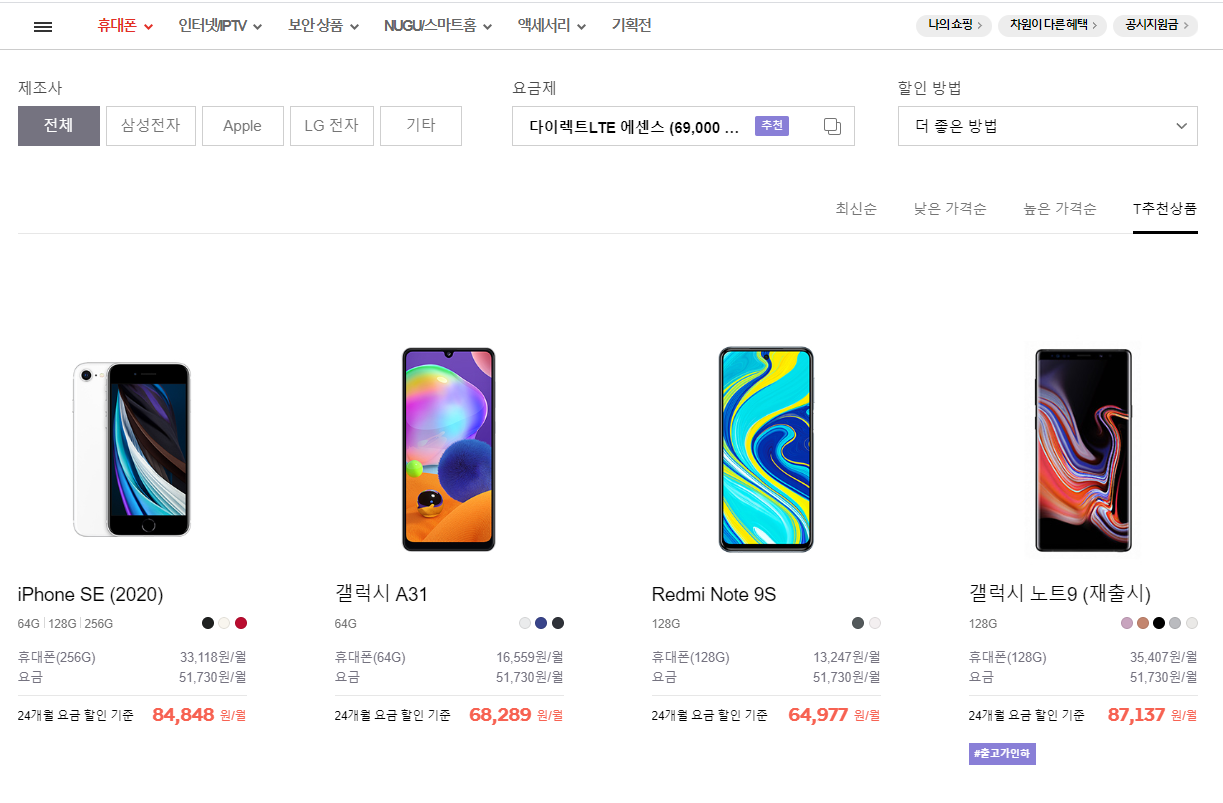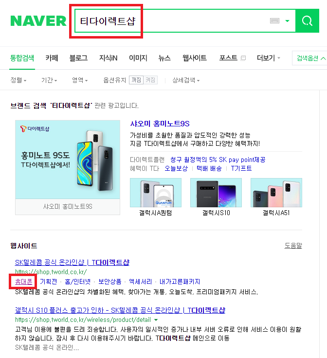 티다이렉트샵을 검색하고 휴대폰 카테고리로 들어갑시다!