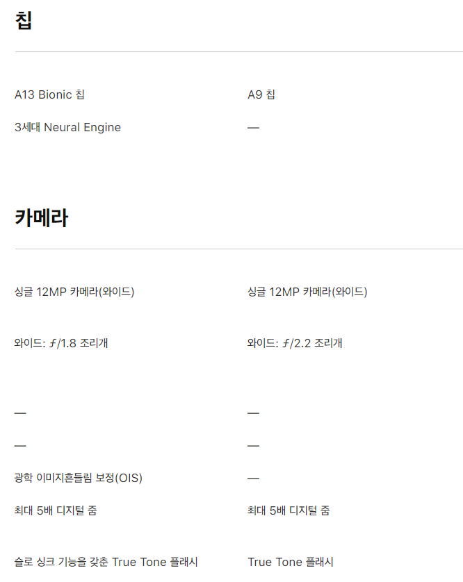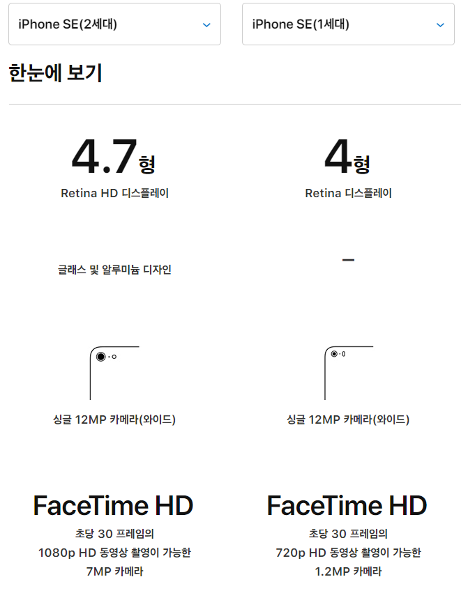 애플 홈페이지에서 비교를 통해 아이폰 SE 1,2세대 차이를 쉽게 볼 수 있었습니다.