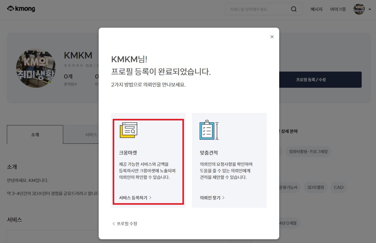 처음 시험 삼아 올린 곳이 바로 크몽입니다.