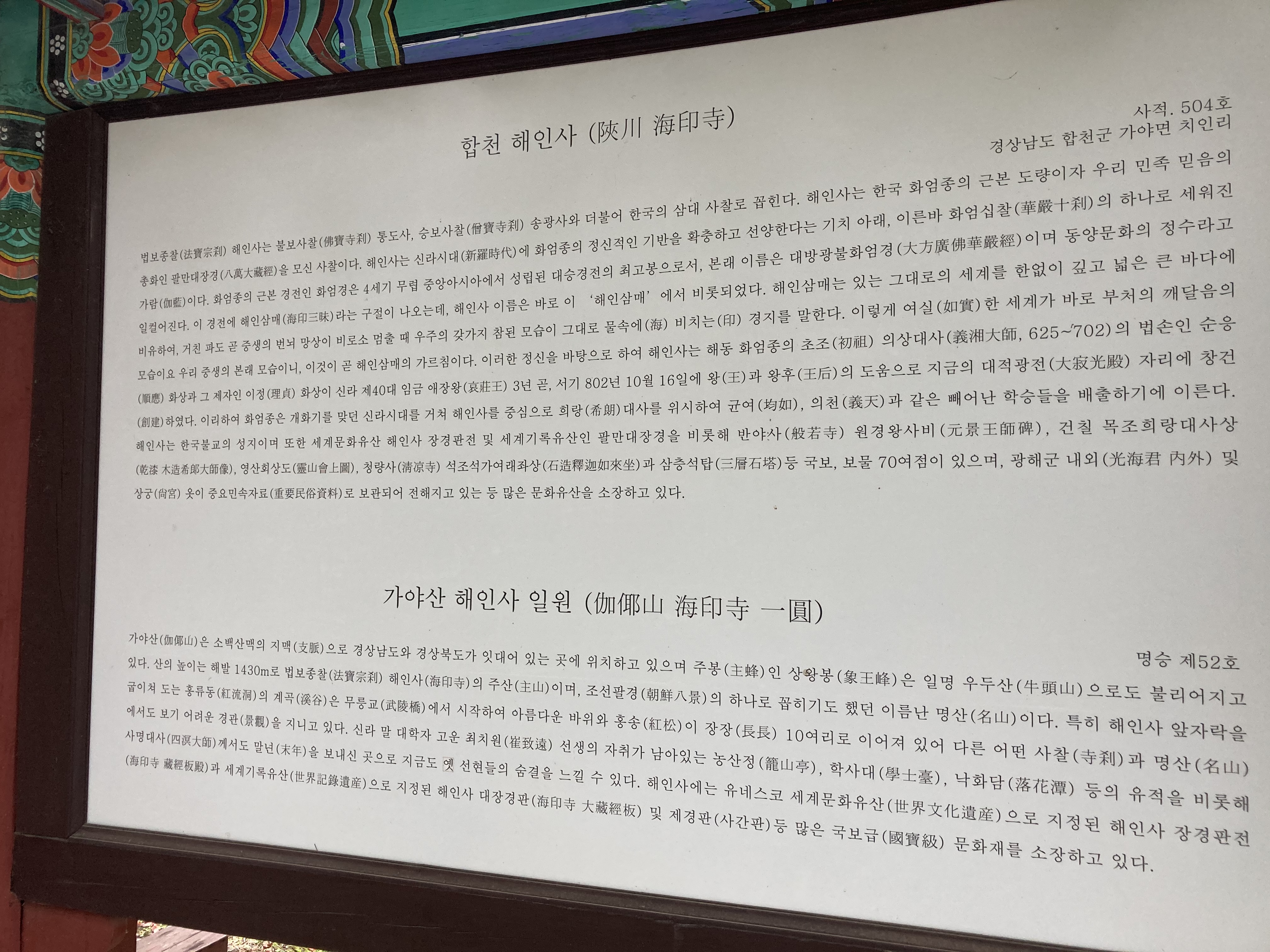 입구로 들어가기전에 해인사에 대해 알아보기 위해 쓰여있는 글을 한번 읽어 봤습니다.