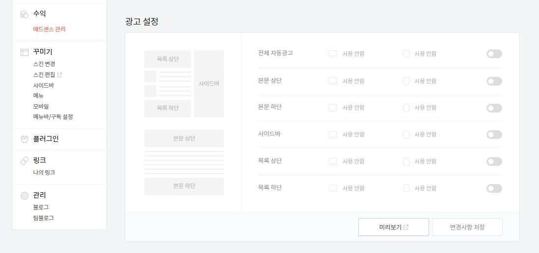 추가하지 않아도 되고 바로 티스토리에서 쉽게 설정을 할 수 있습니다. (단, 중간광고 삽입은 예외)
