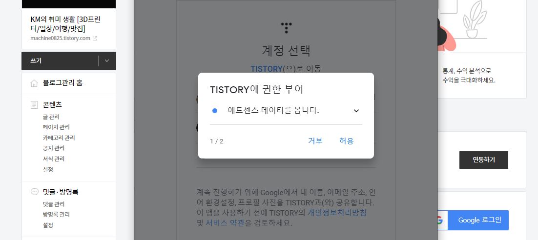 로그인을 하면 티스토리에 애드센스 데이터를 보거나 연동 허용 여부를 선택해주고,