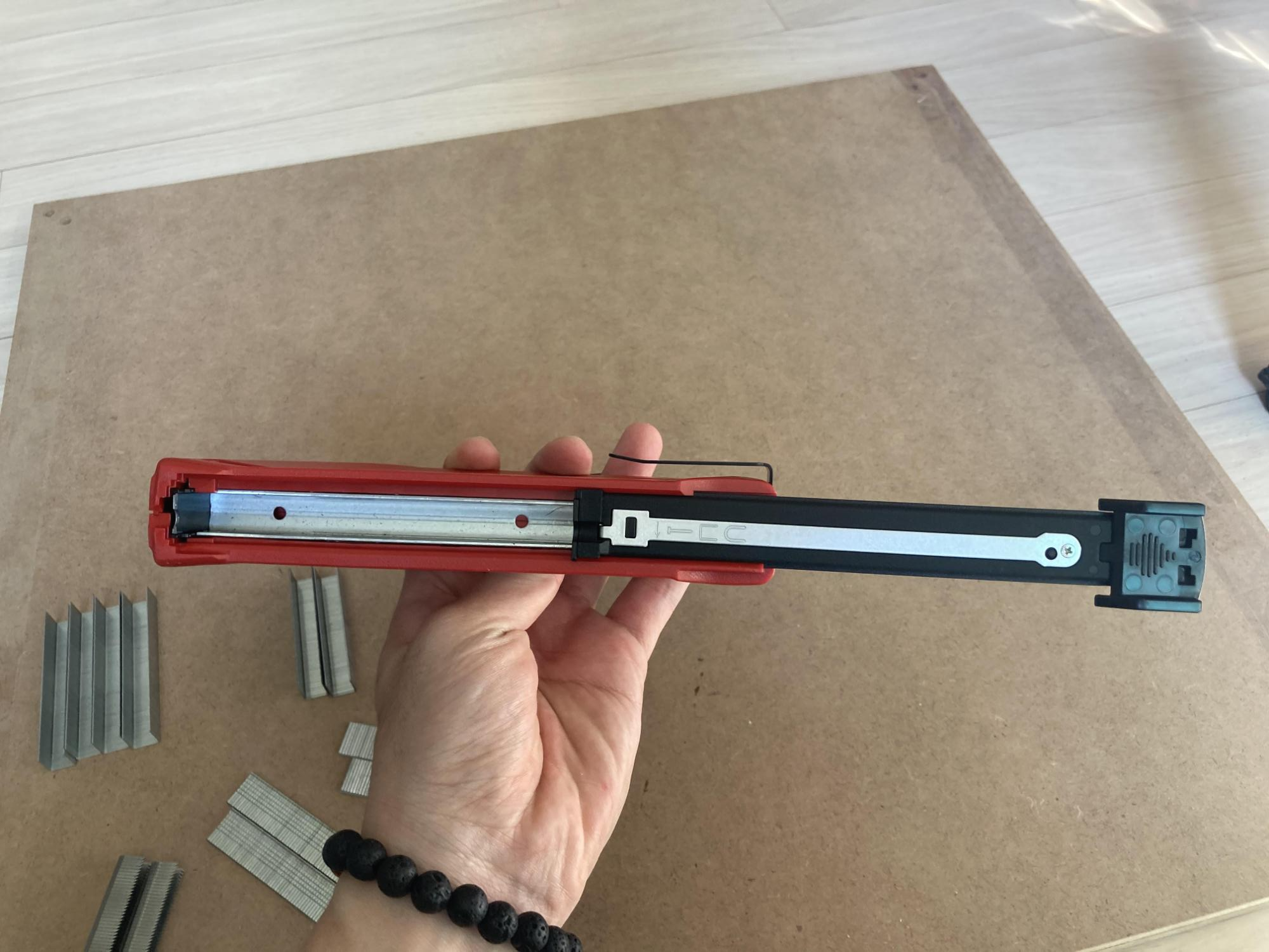 타카기는 생각보다 많이 가벼웠고, 손잡이 아래쪽에 보시면 +, -로 타카 강도를 선택할 수 있습니다.