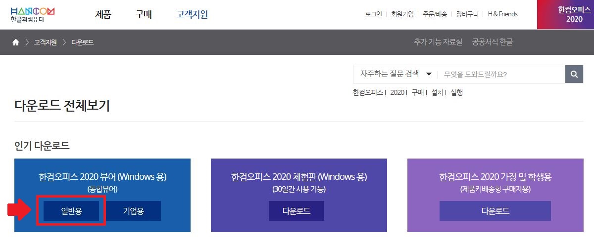여기서 '한컴 오피스 2020 뷰어' [일반용]을 클릭해서 다운로드를 진행합니다.