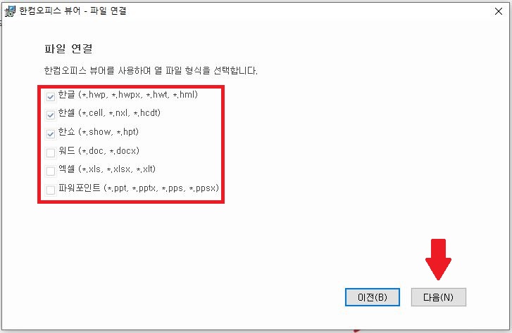 그리고 한글오피스 뷰어로 사용할 파일 형식을 선택해주고 [다음(N)]을 눌러줍니다.