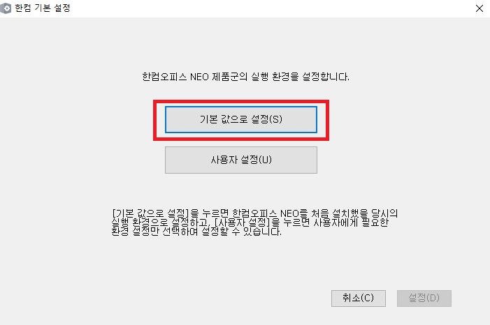 이렇게 한컴 기본 설정 화면이 나오는데 여기서 보통 [기본 값으로 설정]을 누르면