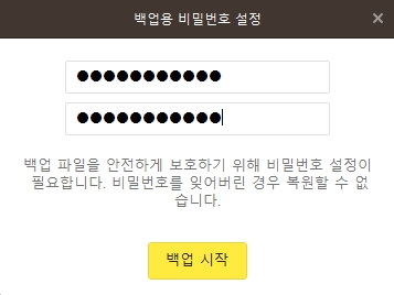백업용 비밀번호 설정 화면이 나오는데, 여기 비밀번호는 카카오톡 로그인시 사용하는 비밀번호가 아니라