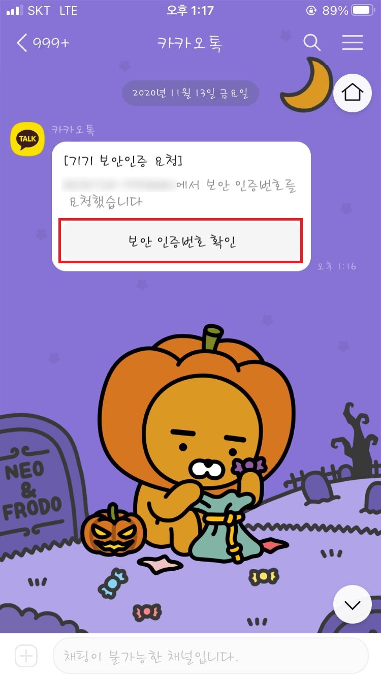 인증번호는 휴대폰에 앱으로 사용 중인 카카오톡에서 확인을 해야 합니다.