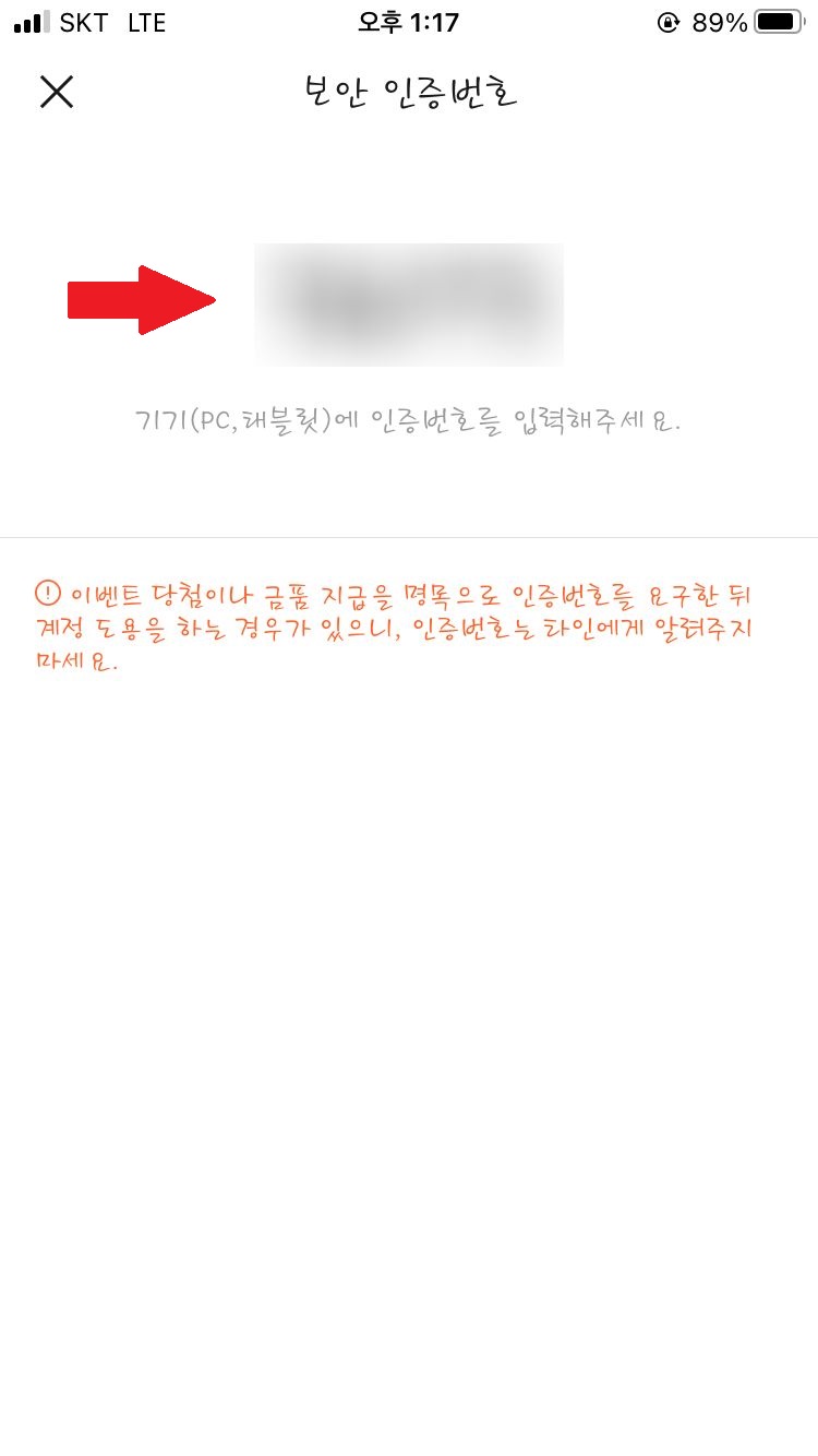 메시지에서 [보안 인증번호 확인]을 눌러주면 우측과 같이 4자리 번호가 화면에 나타납니다.
