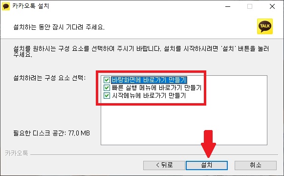 카카오톡 PC버전을 설치했을 때 아이콘을 생성할 위치를 선택해 주시고, [설치]를 눌러주세요.