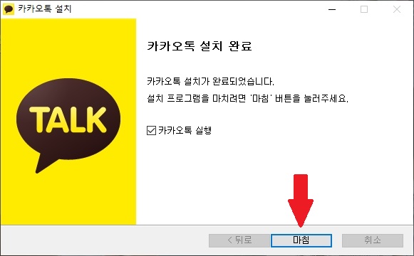 카카오톡 PC버전 설치가 진행이 되고 완료가 되면 [마침] 버튼을 눌러 줍니다.