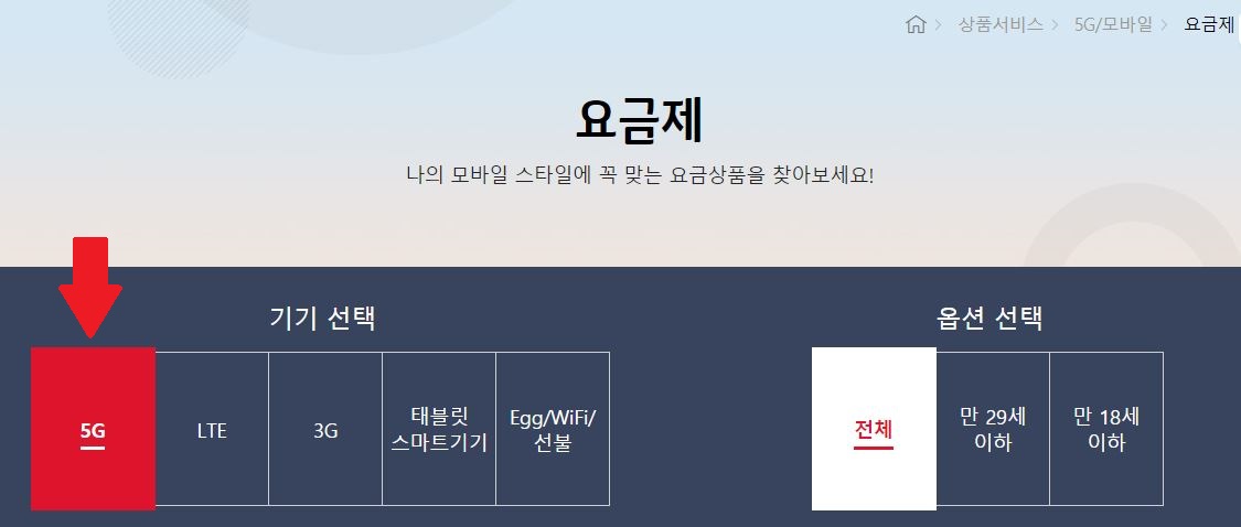 요금제에 들어가면 기기 선택 화면이 나오는데 오늘은 기기가 5G용 기기라 가정하고,