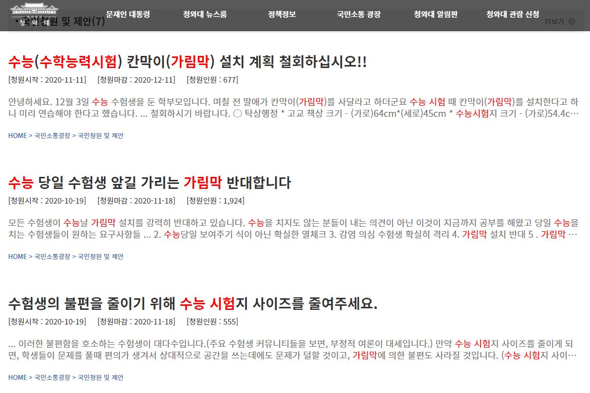 수능 칸막이가 등장하면서 많은 문제점이 제기되고 심지어 청와대 국민청원에 까지 올라왔는데