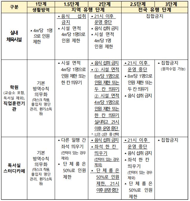 거리 두기가 3단계로 격상되면 중점관리시설 / 일반관리시설 구분 없이 필수 시설 외 운영이 제한되며