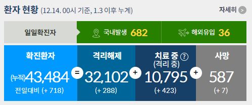 코로나 19 신규 확진자가 어제 12/14 기준으로 전일 대비 718명의 확진자가 발생했고,