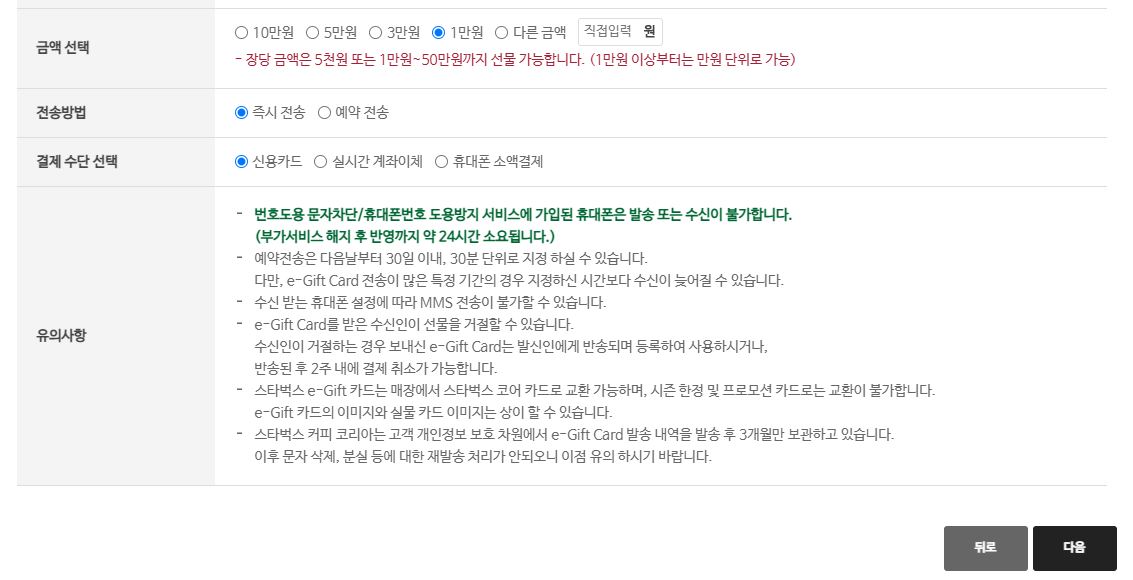마지막으로 선물하실 스타벅스 e-기프트카드의 충전금액을 선택해주시고,
