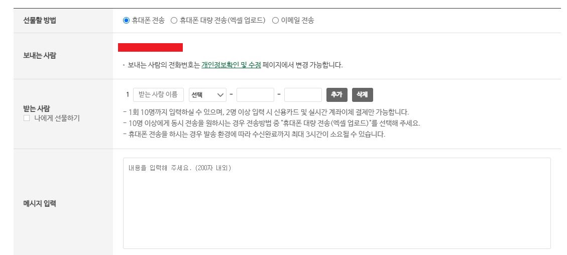 선물을 받을 사람의 정보와 메시지를 입력하는 창이 나옵니다.