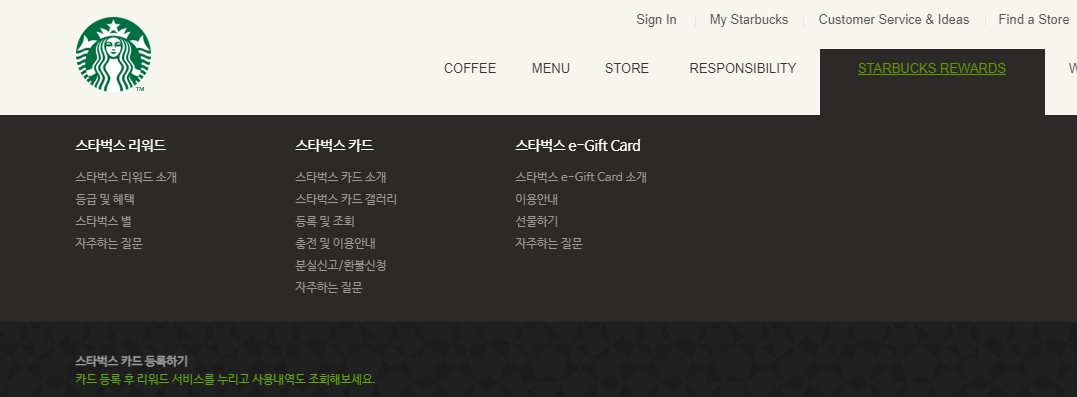 스타벅스 메인 홈페이지에서 상단 [Sign In]을 눌러서 로그인하시거나 회원이 아니신 분들은 회원가입을