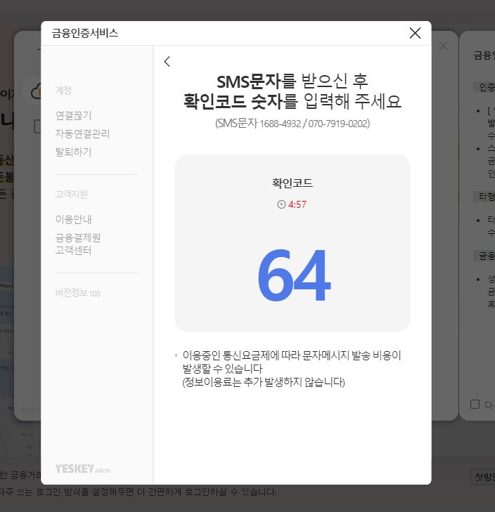 개인 정보를 입력하고 [확인]을 누르면 문자메시지가 날아오고 화면에 나타난