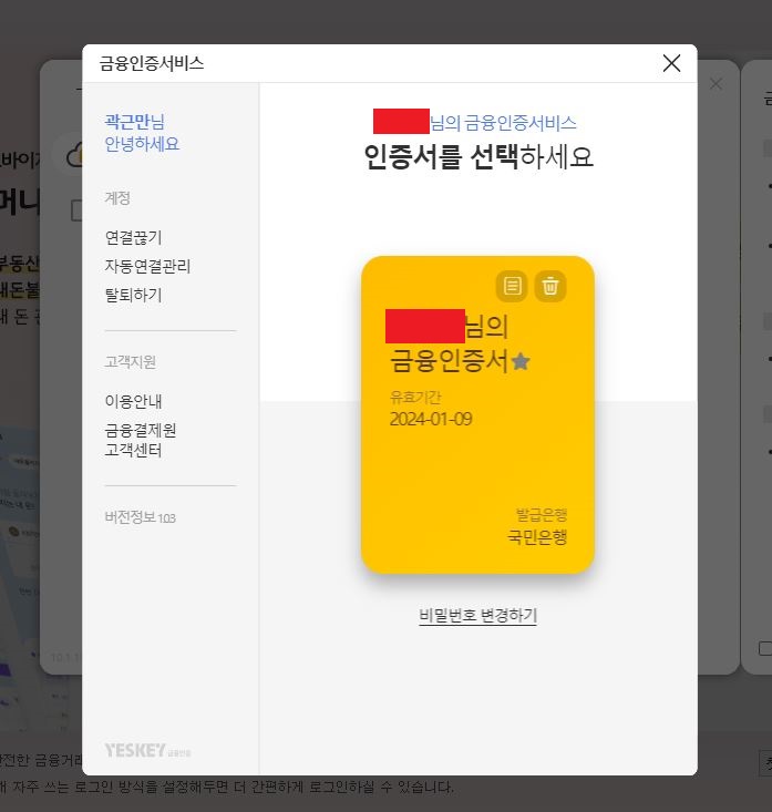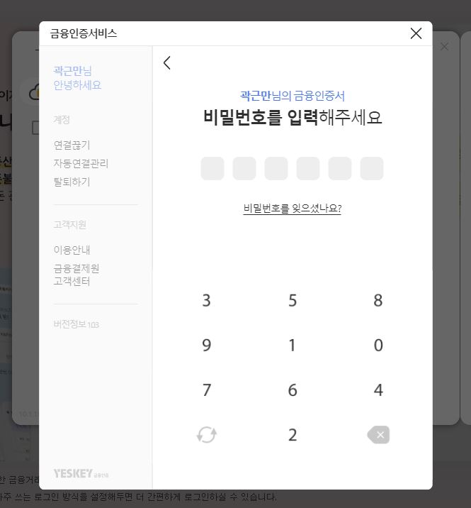 이렇게 로그인이 완료되고, 공인인증서와 동일하게 금융인증서로