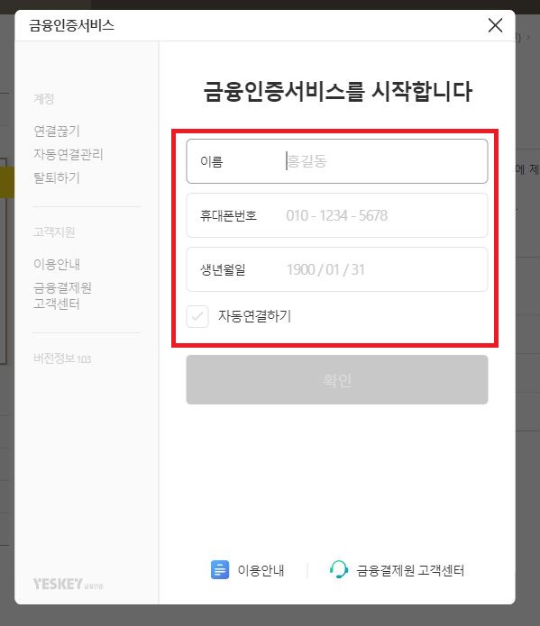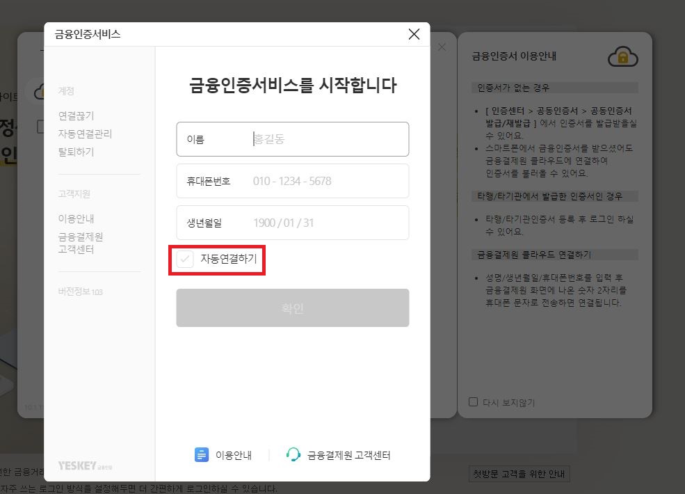 공란에 정보를 정확히 입력하고 [확인]을 눌러주세요, 여기서 [자동 연결하기]가 있는데