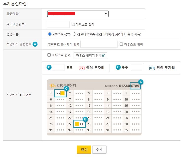 저는 주거래 은행이 농협이지만 현재 농협 보안카드가 없어서 국민은행으로
