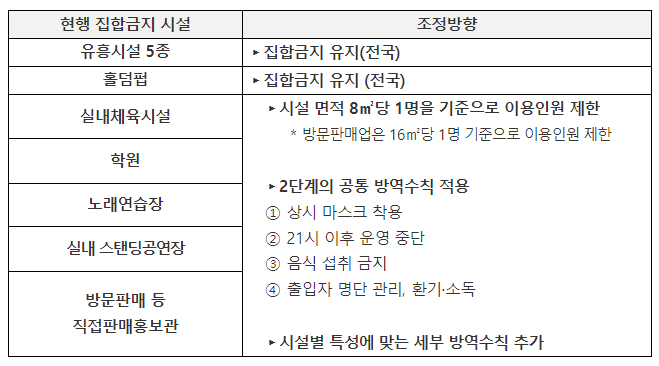 비수도권은 100인 이상이 모이는 모임 / 행사가 금지, 다중이용시설 내 취식 금지 등 운영이