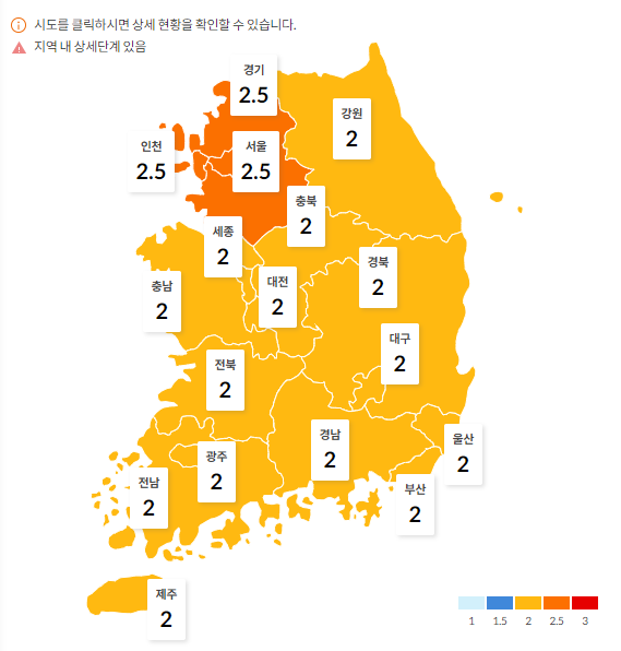 현재는 수도권만 2.5단계이고 나머지 지역은 모두 2단계입니다!