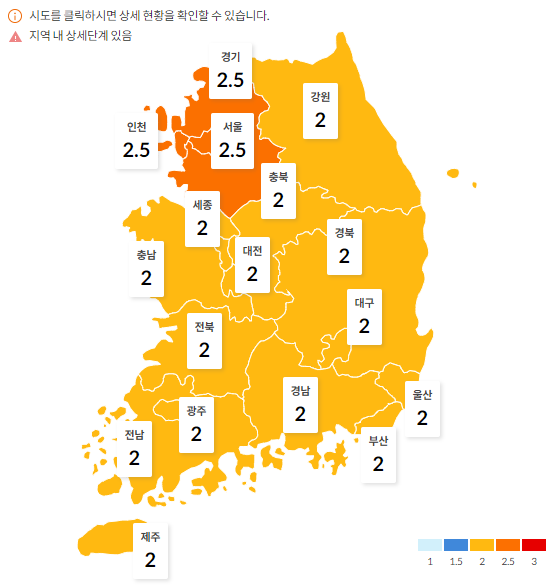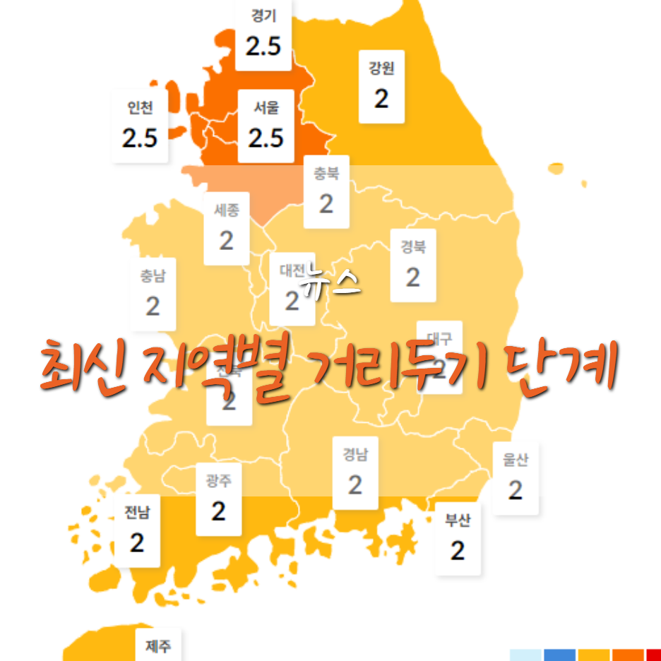 수도권 서울, 인천, 경기 지역은 2.5단계이며 나머지 비수도권 지역은 2단계가