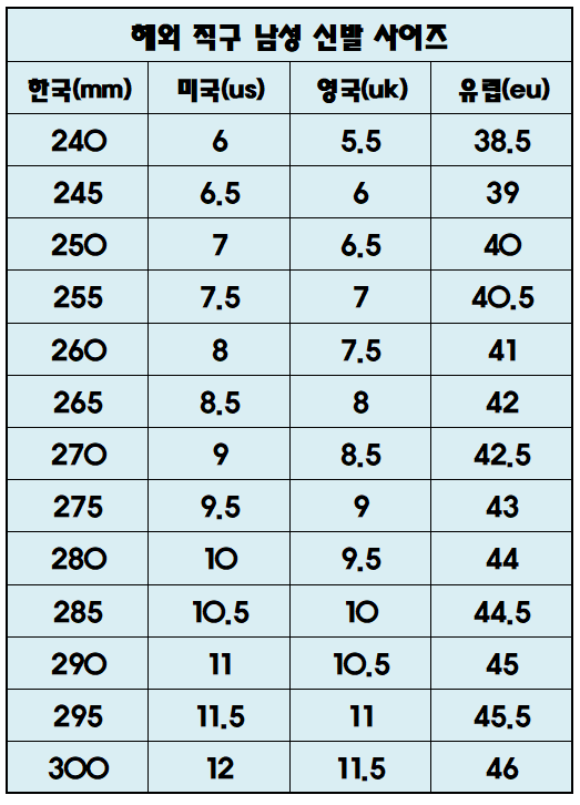 직접 정리해봤습니다. 해외 직구로 신발을 구매하실 분들은 참고하세요!