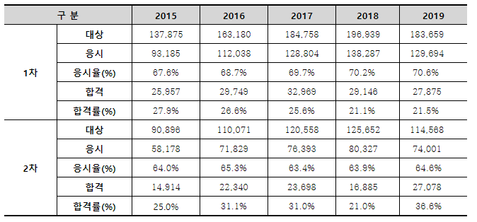 2015년부터 2019년까지 자료를 보시면 합격률(%)이 최저 21%, 최고 36.6%로 약간의 편차를 보이는 것을