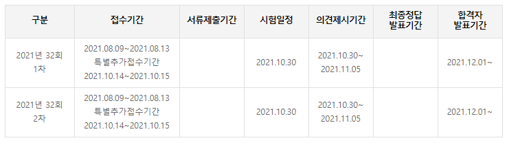 올해 2021년 공인중개사 시험은 32회 차이며 시험일은 올해 10월 30일입니다.