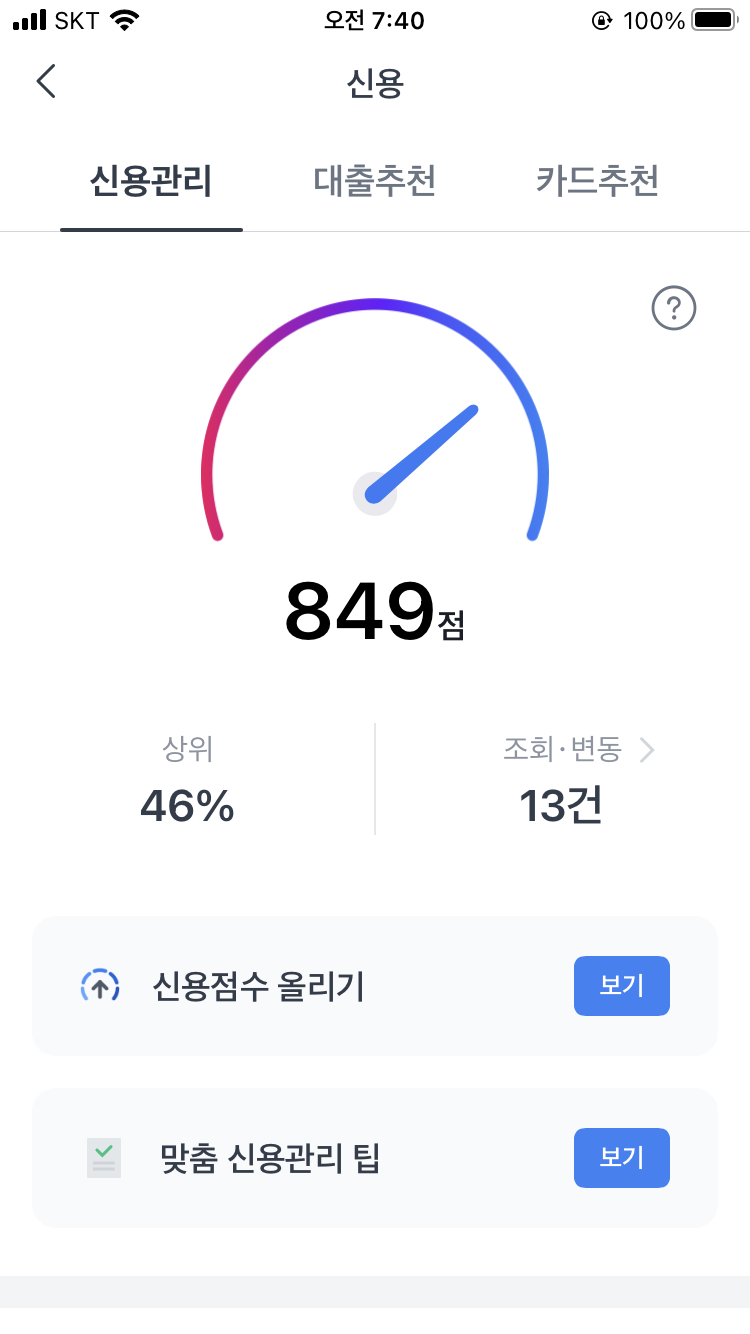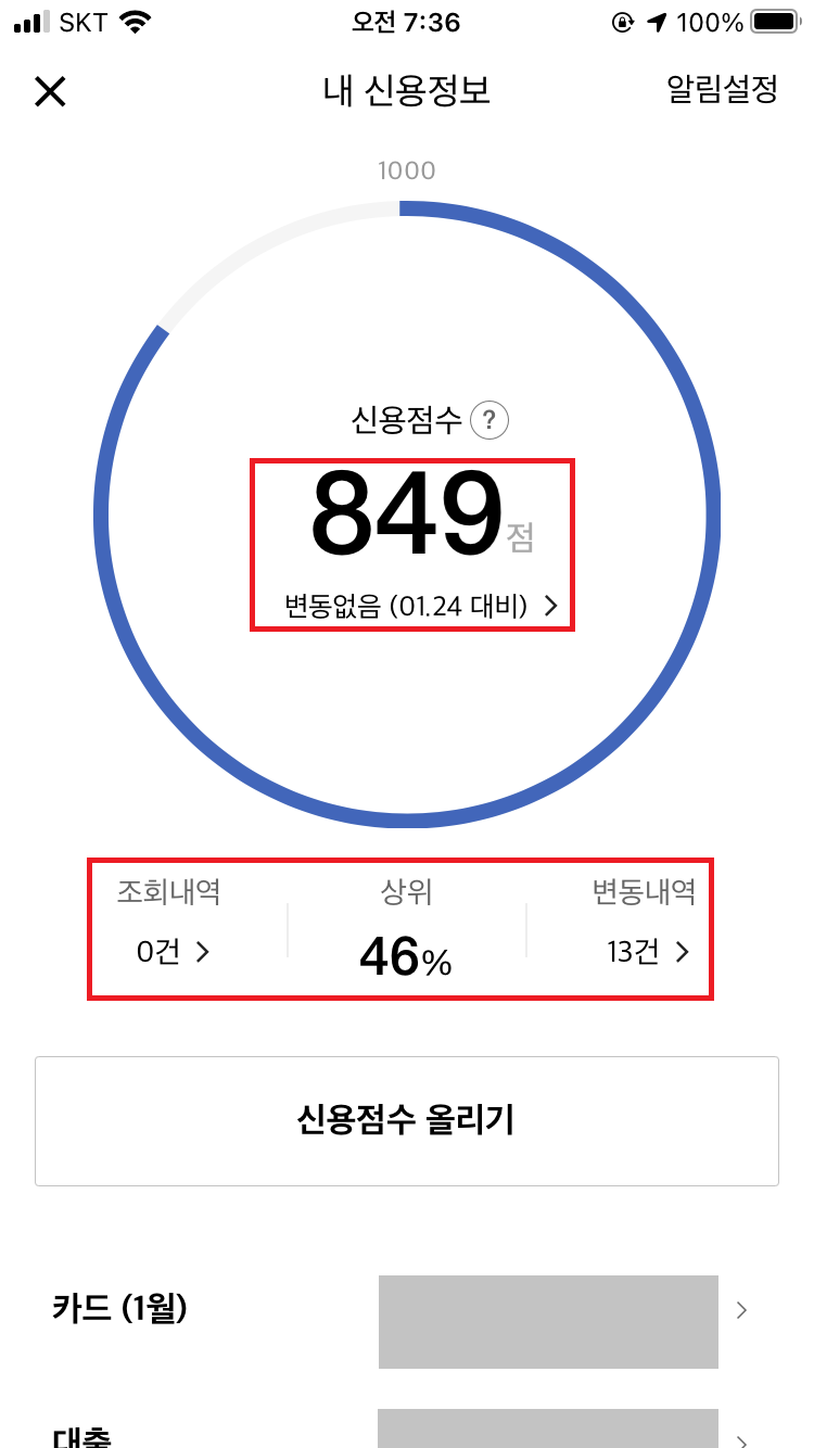 본인의 신용점수와 상위 몇 % 까지 확인이 가능하며,
