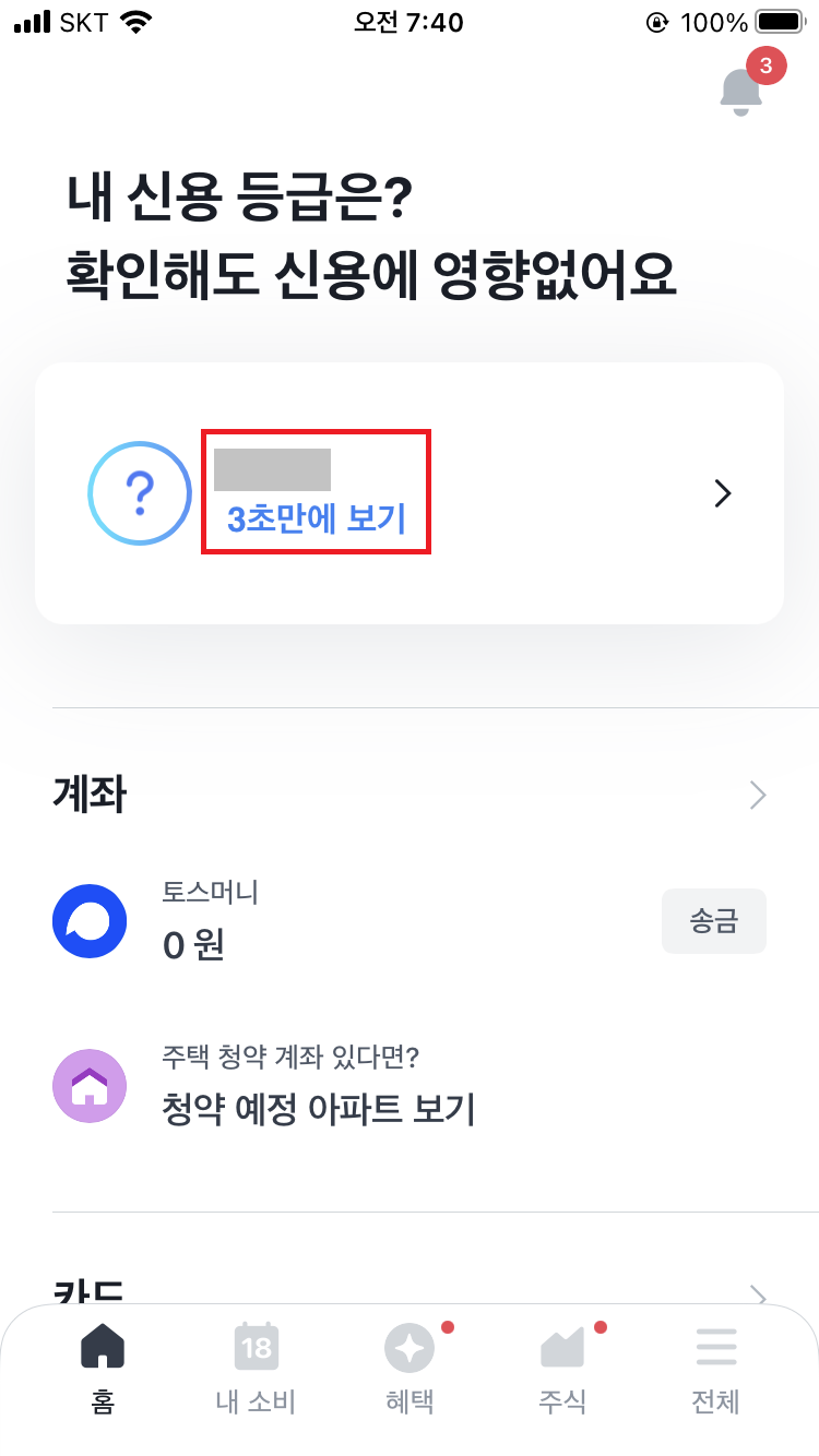 홈에서 [3초 만에 보기]를 누르면 카카오 뱅크와 마찬가지로 본인의 신용점수와