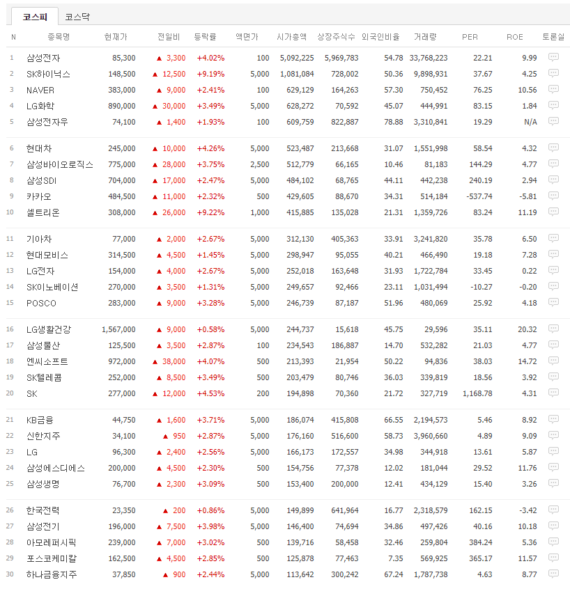 오늘 코스피 상위 30개의 업체를 보면 모두 상승으로 마감한 것을 확인할 수 있습니다.