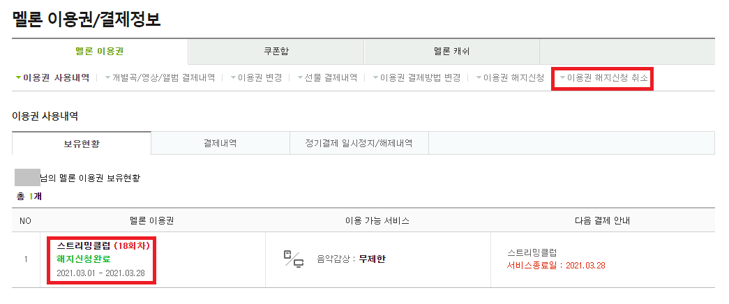 [마이뮤직] 상단에서 [이용권 해지신청 취소]를 눌러주시면