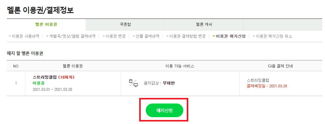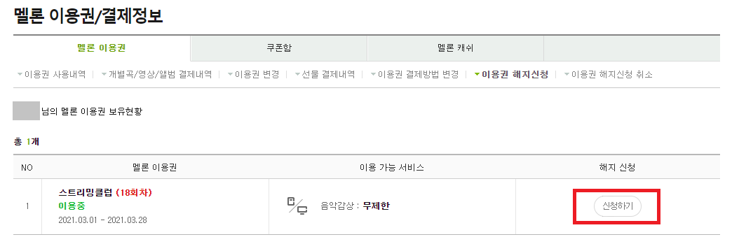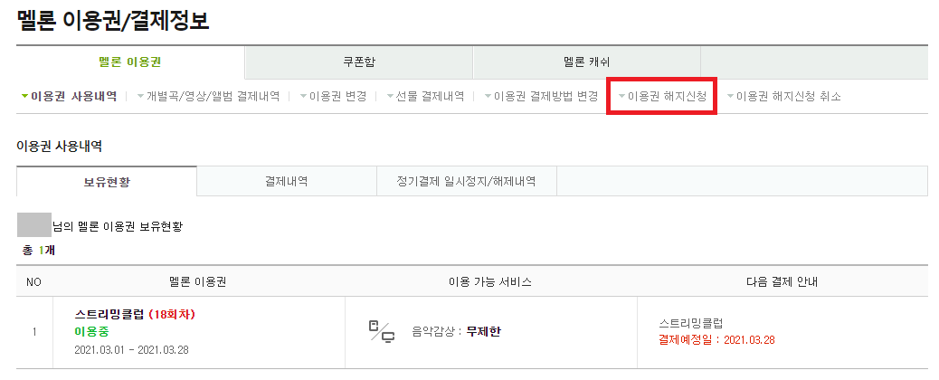 마이뮤직에 들어가도 멜론 이용권 해지를 할 수 있는 항목이 보이지 않는데