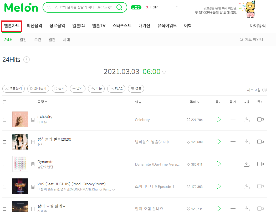 먼저 아래 멜론 사이트로 들어가 봅시다!