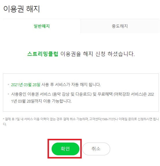 마지막으로 [확인]버튼을 누르면 이용권 해지가 완료됩니다.