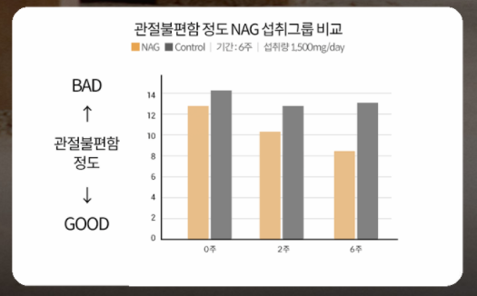주요 성분인 MSM과 NAG 모두 복용 후 관절의 불편함 정도가 개선되는 모습을