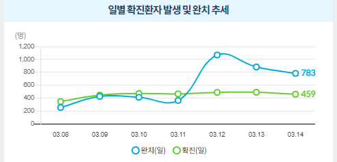 좀 더 보기 쉬운 그래프를 보면 다행스럽게 완치자의 수는 늘어나고 있지만