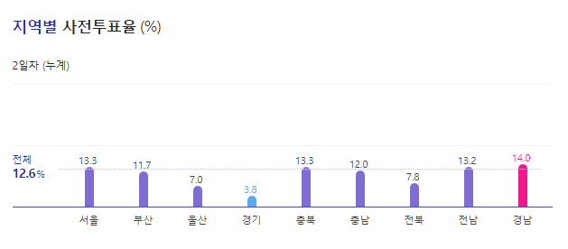 전체 사전 투표율 평균이 12.6%이며 지역별 사전투표율을 보면