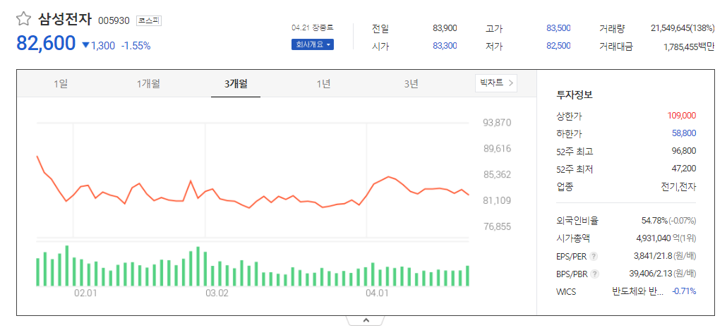 어제 보다 1.5%, 1,300원 하락한 82,600원에 마감을 했는데요,