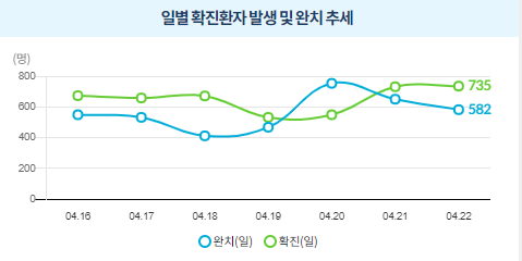오늘 4/22 기준으로 코로나 19 신규 확진자가 735명 발생했습니다.