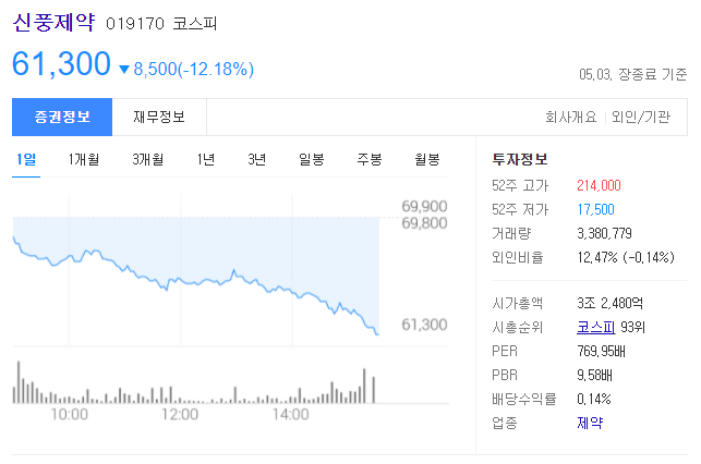 특히 신풍제약은 전일 대비 무로 12% 이상 하락한 것을 볼 수 있습니다.