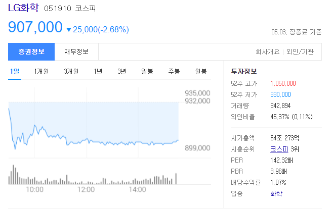 바이오 종목에 비해 큰 하락은 아니지만 2차 전지 관련 종목인 LG화학과 삼성 SDI 역시
