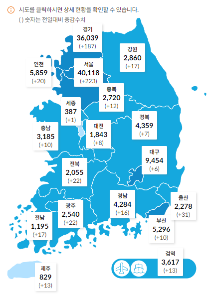 지역별 코로나 19 확진자 수를 보면 정말 지겹게도 서울, 경기 지역은 여전히