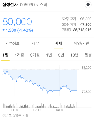 - 삼성전자 : 80,000 (전일 대비 1.48% 하락)