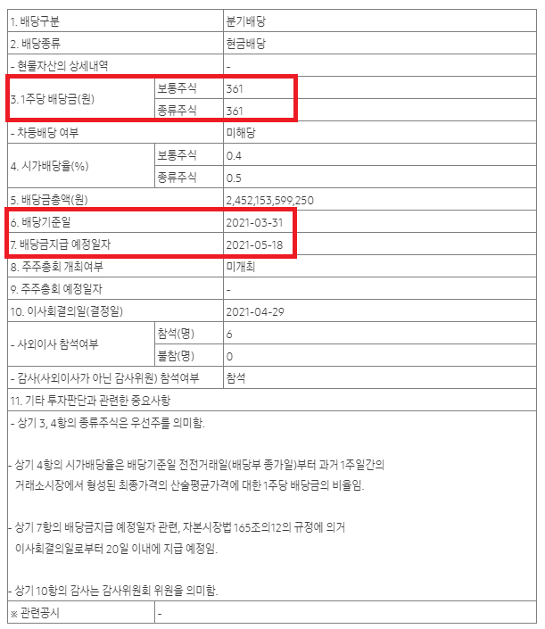 그리고 올해 1분기 배당금은 주당 361원(보통주, 우선주 동일)이네요.