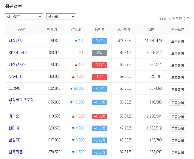 어제 5/26 장 마감 기준으로 우리나라 코스피 상위 10개 기업의 주가를 한 번 살펴봤는데요,